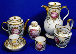 A magnificent porcelain coffee and tea-set painted in purple monochrome with oval river landscapes containing figures/ The groundwork gilding forms scrolling foliage, tendrils and bands.