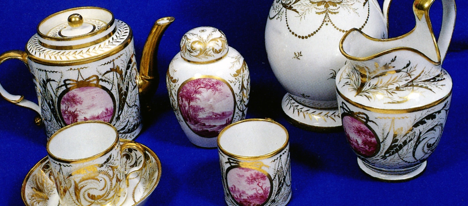 The pieces on display include a teapot, coffee pot, sucrier, milk jug, tea caddy, bowl, coffee cans and saucers. The five years between 1802-1808 remains somewhat of a mystery. It has been suggested that Billingsley spent his time experimenting with porcelain bodies and shards found on the site and a part tea set from the GRG Exley Loan Collection at the Usher Gallery support this. However this venture was a commercial failure and it is probable that Billingsley brought French ware ‘in the white’ for decorating in order to raise funds.