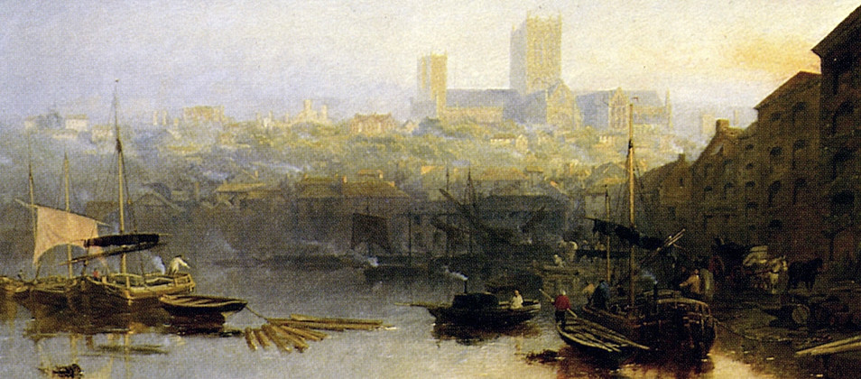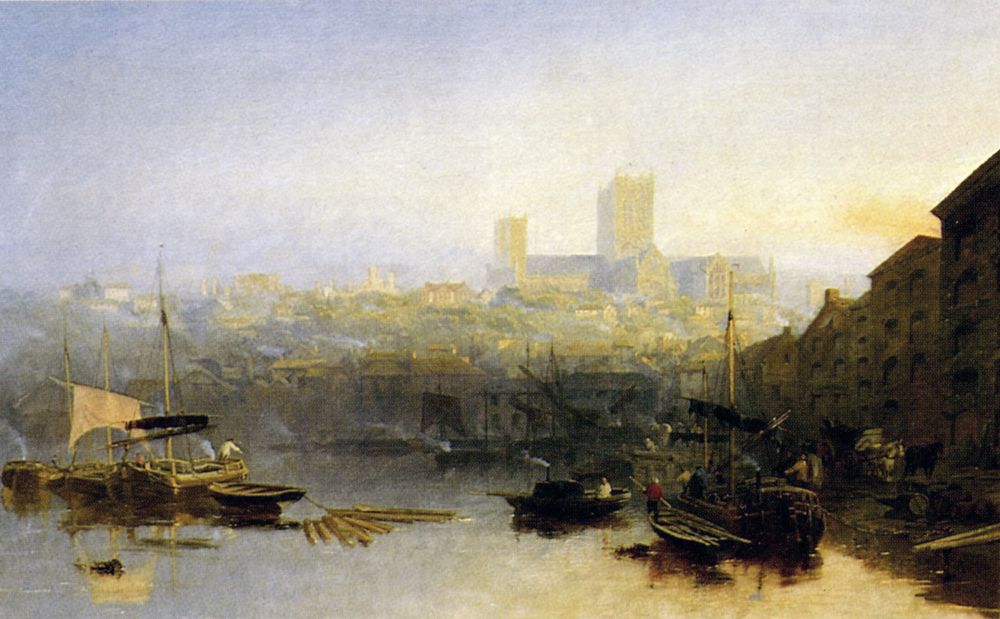 In this painting the artist seems hemmed in by the tall warehouses on the right and beyond. . This coupled with all the smoke rising from the boats and chimneys gives a dark industrial feel to the work and probable a more realistic view of the Brayford in 1858.