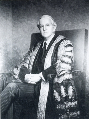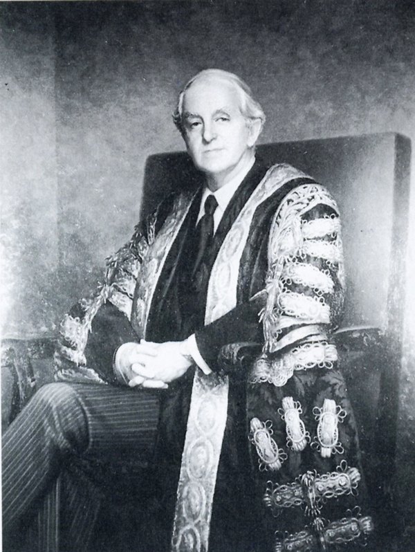 This posthumous portrait shows Sir Francis Hill sitting wearing his ceremonial robes of office.